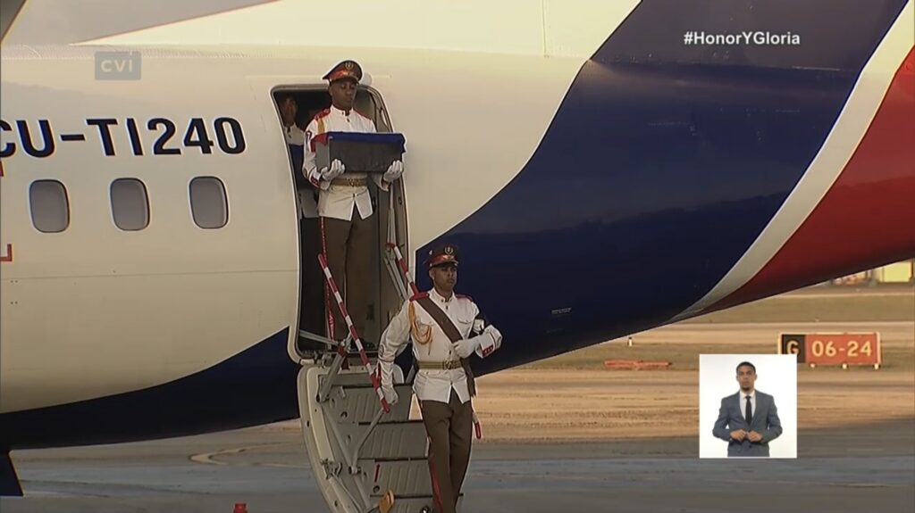 Al pie de la escalerilla del avión, de donde descienden las urnas cubiertas por la bandera de la estrella solitaria, son recibidos por el general de Ejército Raúl Castro Ruz, y el presidente de la República, Miguel Díaz-Canel Bermúdez.