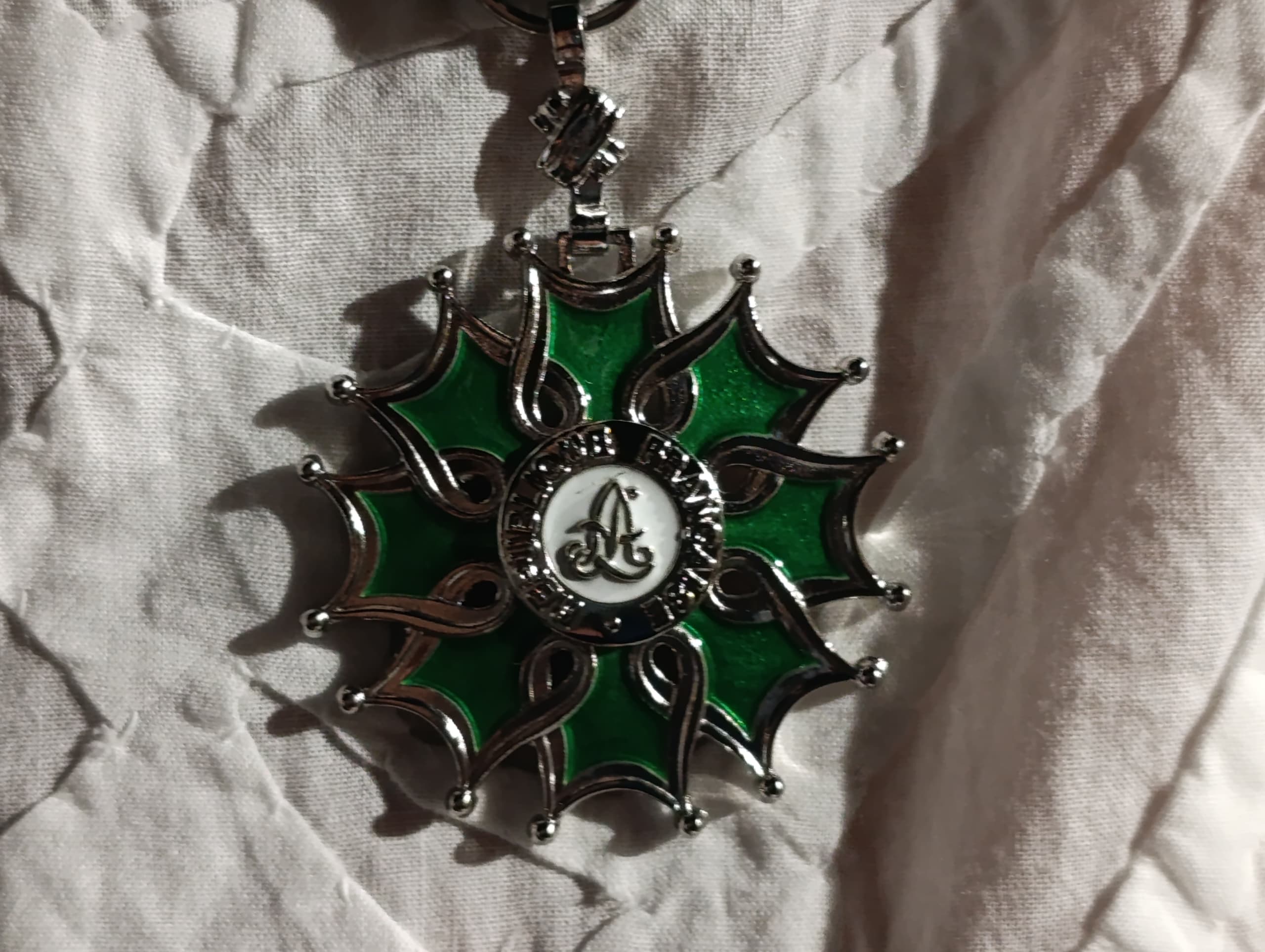 La insignia es una cruz de doble cara con ocho puntas, esmaltado de verde y decorado con una trama con forma de arabesco plateado o dorado para los oficiales y comendadores, teniendo estos últimos una insignia más grande. Se distingue sobre el medallón central un monograma de las letras A y L.