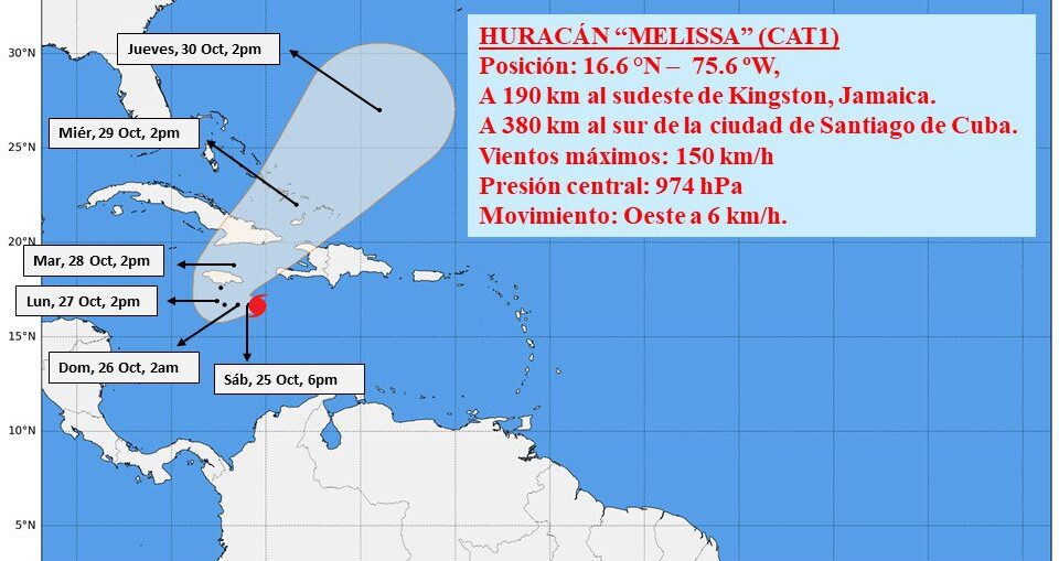 En las próximas horas Melissa mantendrá su trayectoria hacia el oeste, desplazándose lentamente en las cercanías de Jamaica durante este fin de semana. Se prevé que el huracán Melissa continúe aumentando gradualmente su intensidad y pudiera convertirse en un huracán de gran intensidad en los próximos días.