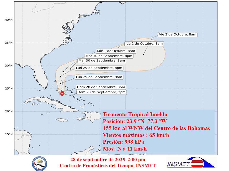 La región central de Imelda fue localizada a las dos de la tarde en los 23.9 grados de latitud Norte y los 77.3 grados de longitud Oeste, posición que la sitúa a unos 155 kilómetros al oeste-noroeste de la porción central de las Bahamas. Los vientos máximos sostenidos se incrementaron a 65 kilómetros por hora, con rachas superiores y la presión central disminuyó a 998 hectoPascal. Actualmente se mueve con rumbo próximo al norte a 11 kilómetros por hora.