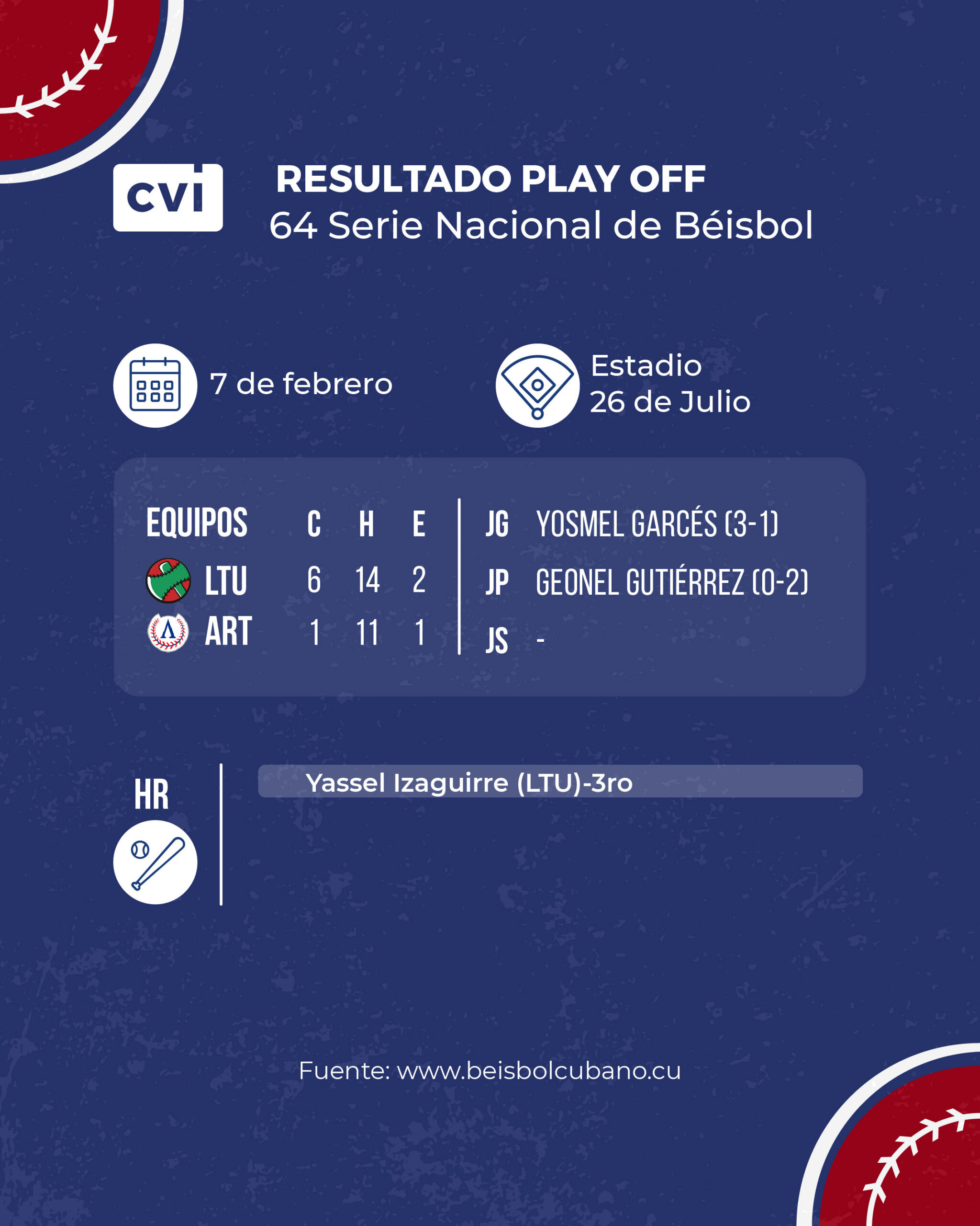 Artemisa, por su parte, dejó varios corredores en posición anotadora y su ofensiva no logró aprovechar las oportunidades para sumar al marcador y apoyar a su pitcheo, encabezado en esta ocasión por su abridor Geonel Gutiérrez, quien permitió cuatro anotaciones y cargó con la derrota.