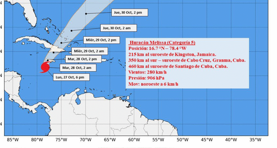 A las seis de la tarde de hoy el ojo del huracán Melissa fue estimado en los 16.7 grados de latitud Norte y los 78.4 grados de longitud Oeste, posición que lo sitúa a unos 215 kilómetros al suroeste de Kingston, Jamaica, a 350 kilómetros al sur-suroeste de Cabo Cruz, Granma y a 460 kilómetros al suroeste de la ciudad de Santiago de Cuba. Melissa se mueve lentamente con un rumbo próximo al noroeste a una velocidad de traslación de seis kilómetros por hora.