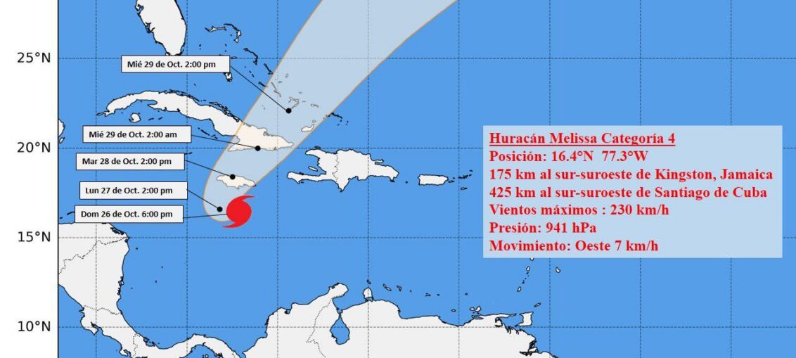 El huracán Melissa durante las últimas 12 horas ha continuado ganando ligeramente en intensidad. Los vientos máximos sostenidos aumentaron hasta 230 kilómetros por hora, con rachas superiores y su presión central descendió hasta 941 hectoPascal, por lo que se mantiene como un huracán categoría cuatro en la escala Saffir-Simpson.