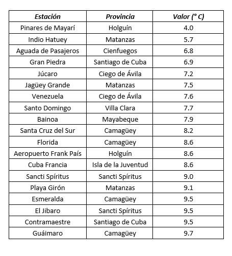 El valor más bajo fue 4.0 grados Celsius y se registró en la estación de Pinares de Mayarí en la provincia de Holguín.