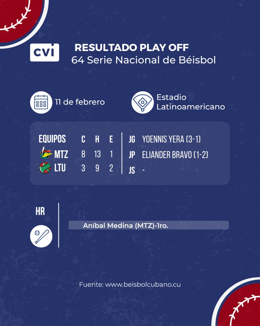 – En el choque se otorgaron once boletos (6-MTZ, 5-LTU) y se conectaron cuatro extrabases (3-MTZ, 1-LTU).